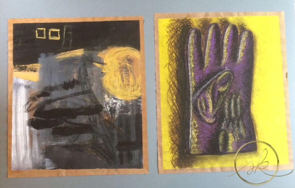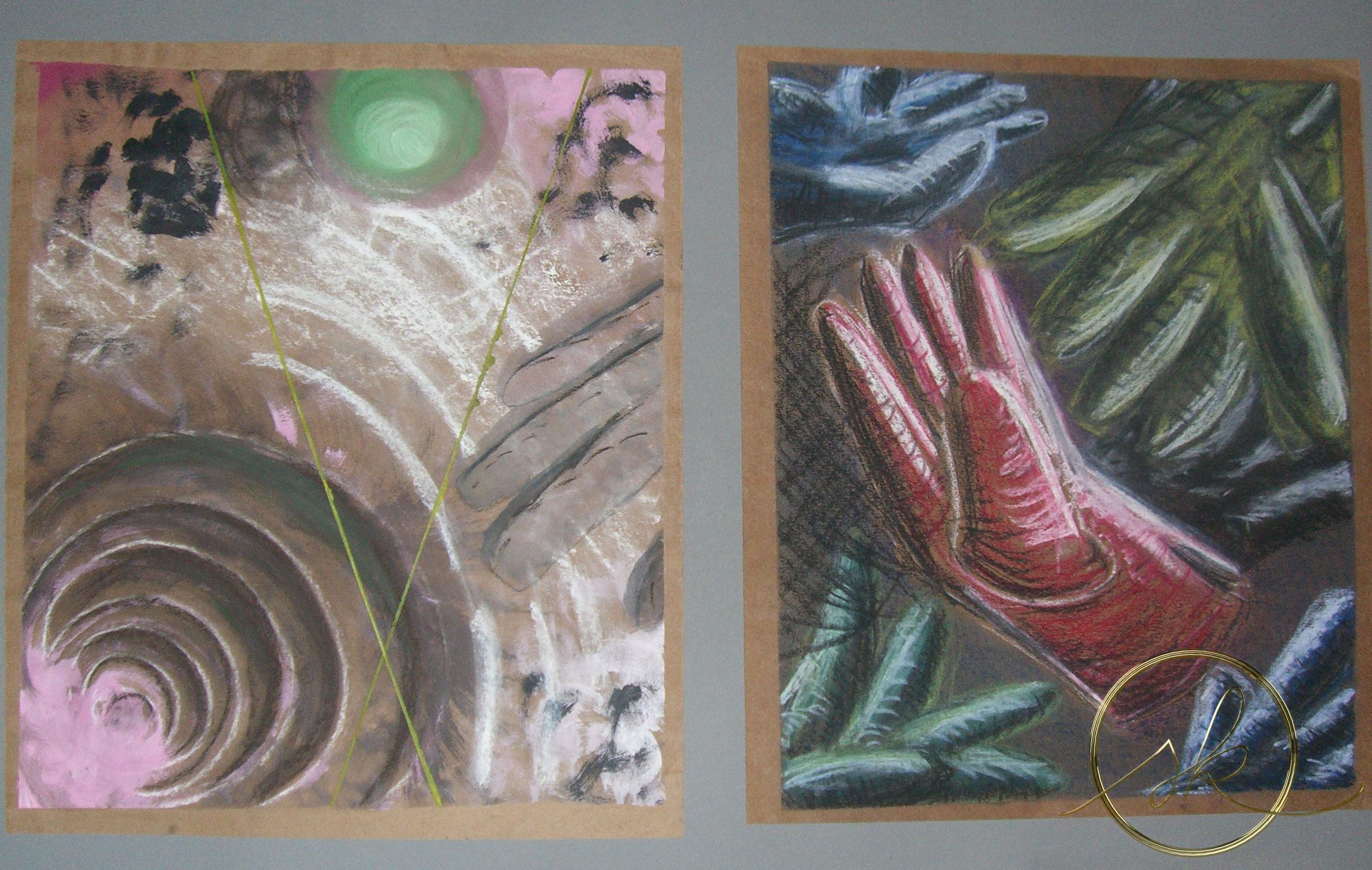 Fünf mit Tusche gezeichnete Handschuhe und eine Handschuh-Fotografie.